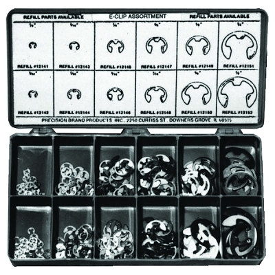 | 605-12910 | (30) 1/8 in; (20) 5/32 in; (30) 3/16 in; (20) 7/32 in; (30) 1/4 in; (30) 5/16 in; (30) 3/8 in; (25) 7/16 in; (20) 1/2 in; (15) 5/8 in; (10) 3/4 in; (5) 7/8 in; Plastic Box | Carbon Steel | External-Radial | 265 per set | 0.1 lb |