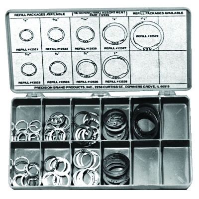 | 605-12935 | (20) 1/2 in; (20) 9/16 in; (20) 19/32 in; (20) 5/8 in; (15) 11/16 in; (15) 3/4 in; (10) 7/8 in; (10) 1 in; (10) 1 1/4 in; Plastic Box | Spring Steel | External-Axial | 140 per set | 1.2 lb |
