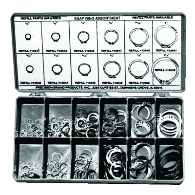 | 605-12900 | (30) 1/4 in; (20) 5/16 in; (50) 3/8 in; (20) 7/16 in; (50) 1/2 in; (20) 9/16 in; (30) 5/8 in; (35) 3/4 in; (10) 13/16 in; (20) 7/8 in; (10) 1 in; (5) 1 1/4 in; Plastic Box | Spring Steel | External-Axial | 300 per set | 0.69 lb |