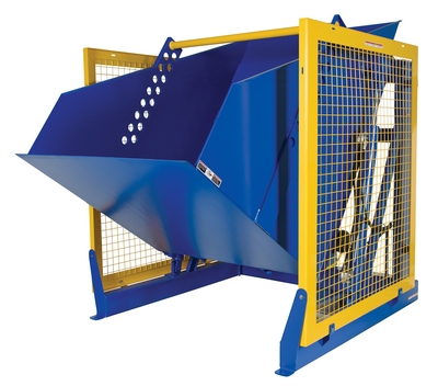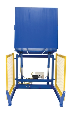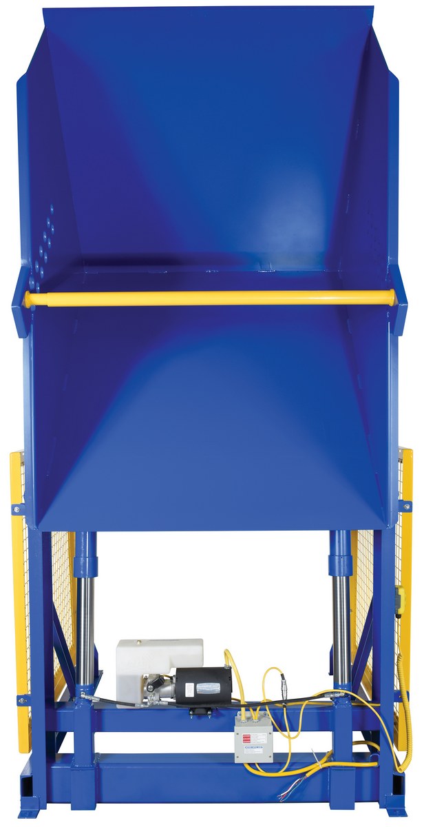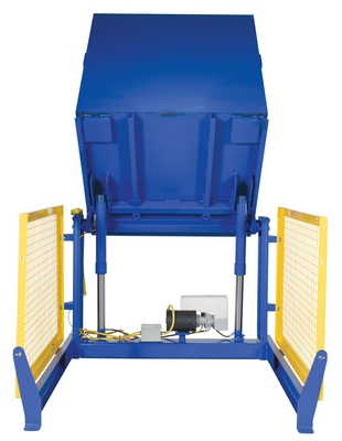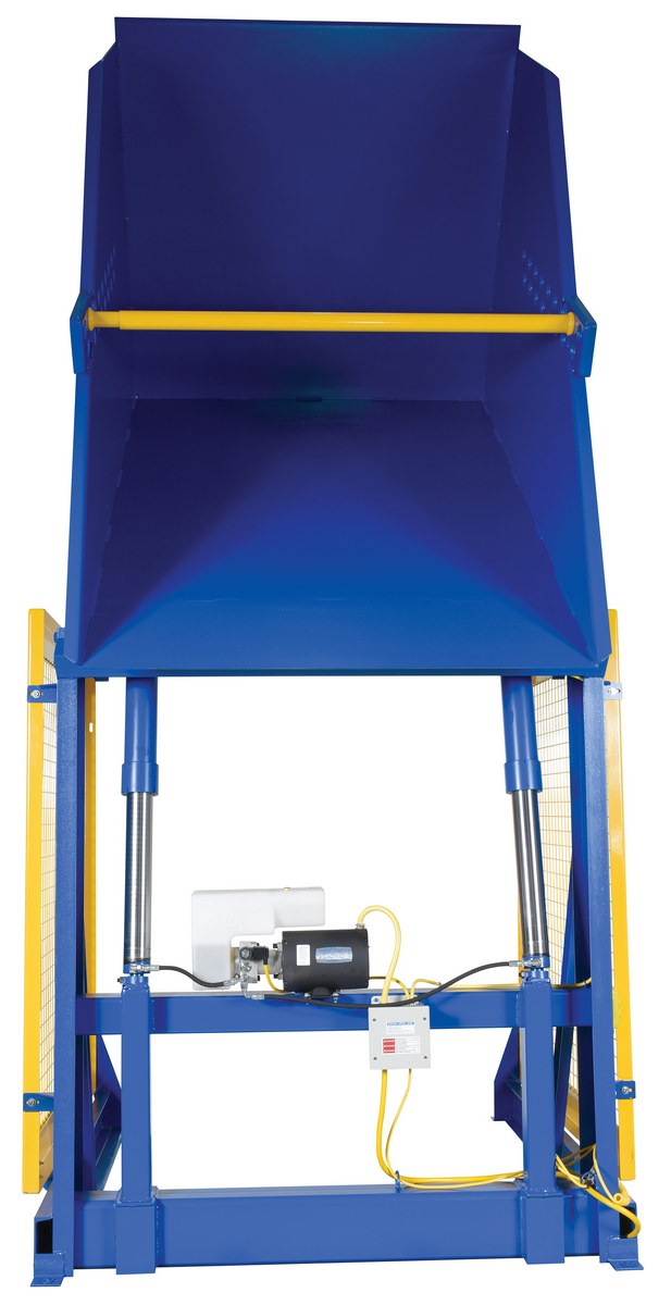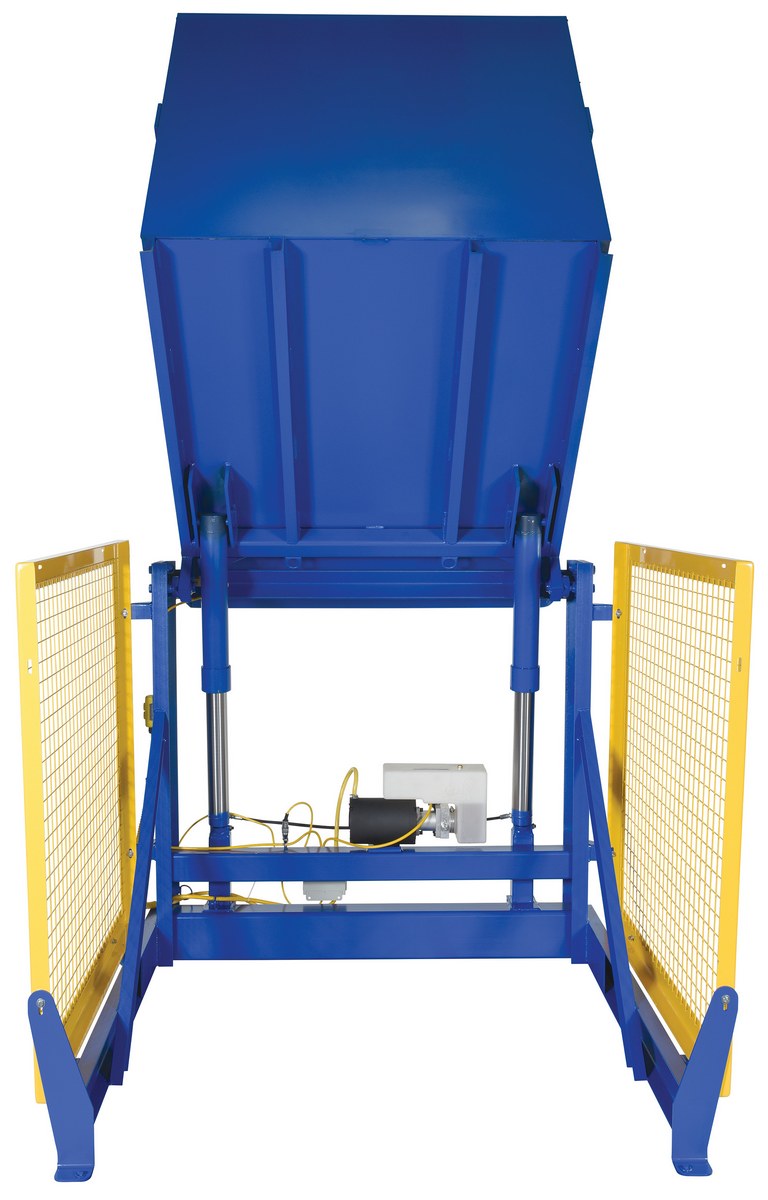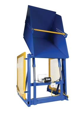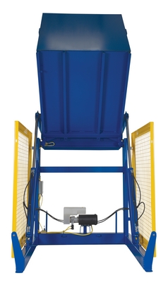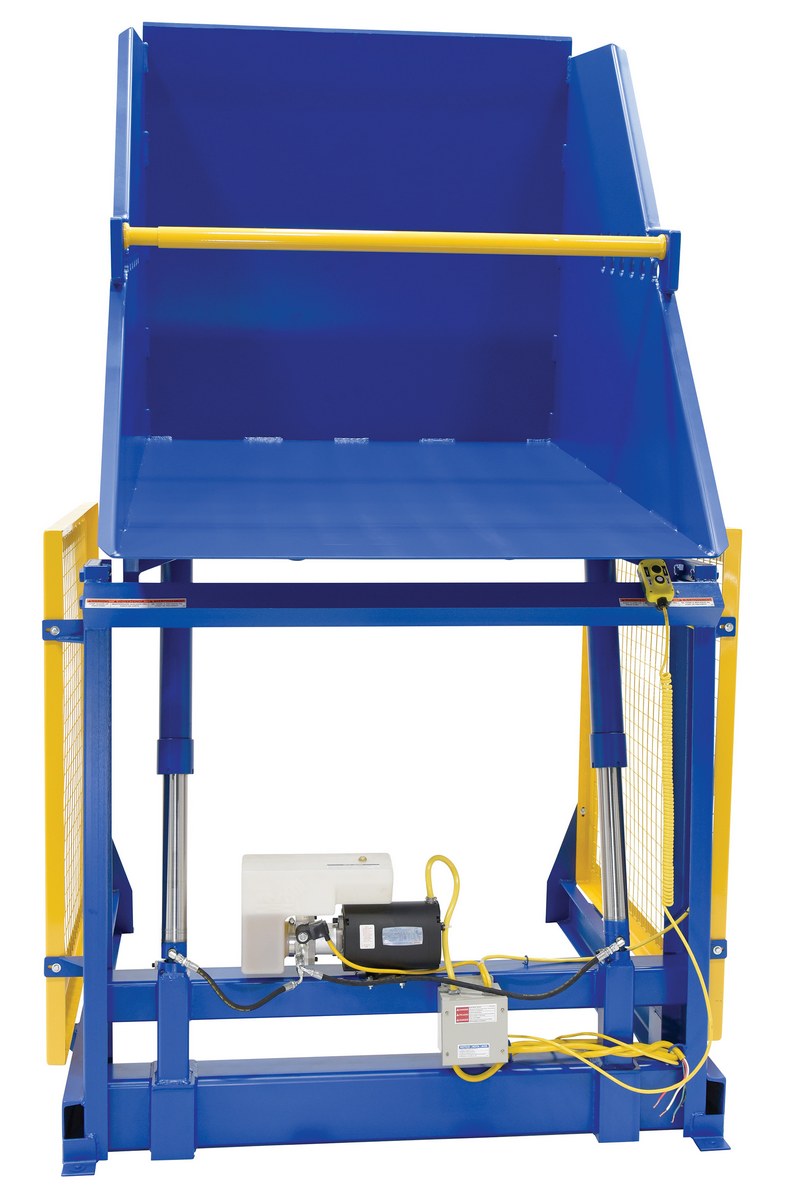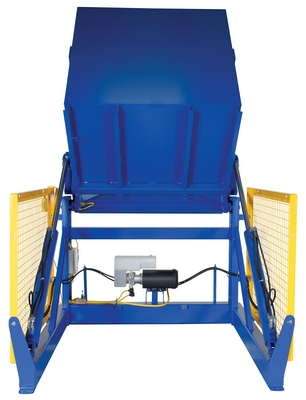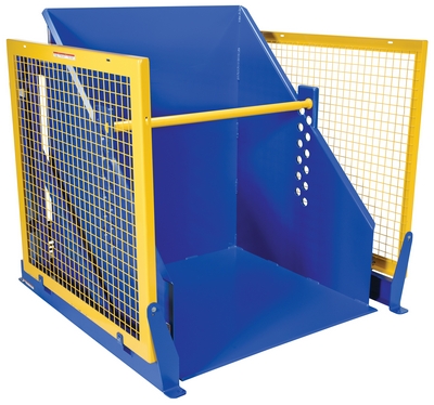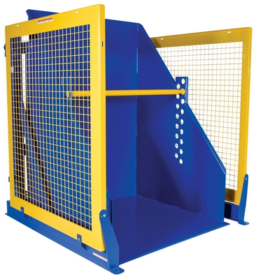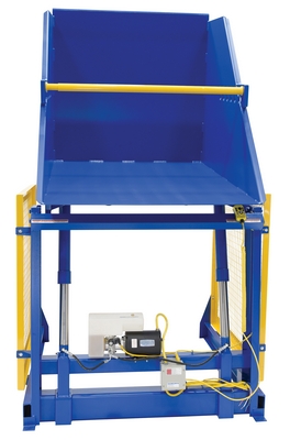 The electric/Hydraulic box dumper is designed for controlled dumping of material from boxes, crates, and other types of containers. It is designed for pallet truck loading and unloading. The retaining bar adjusts to accommodate a wide range of container heights. Each dump height has a hold down range and an internal power unit with a hand held control standard. It has a heavy-duty welded steel construction with protective mesh side screens included.