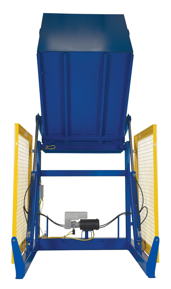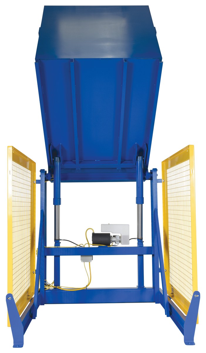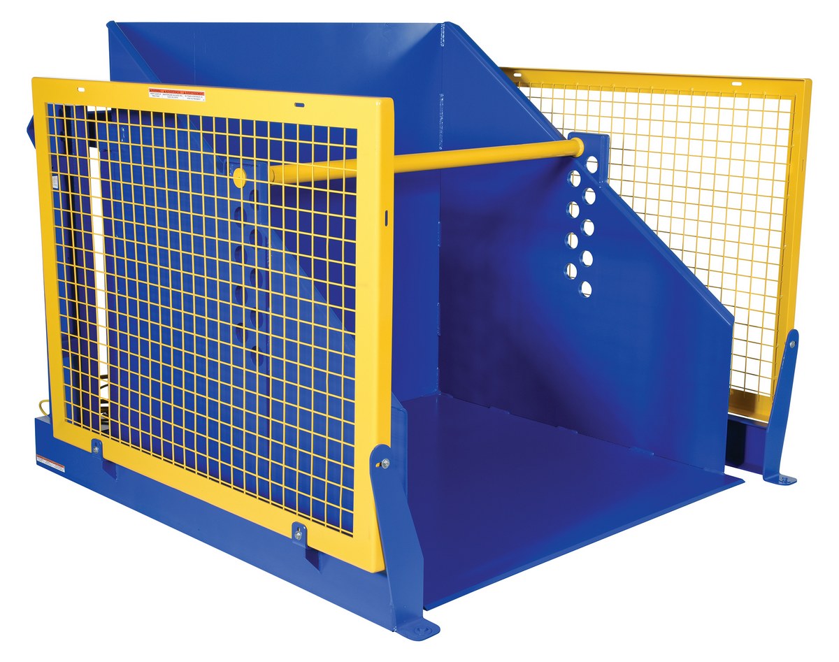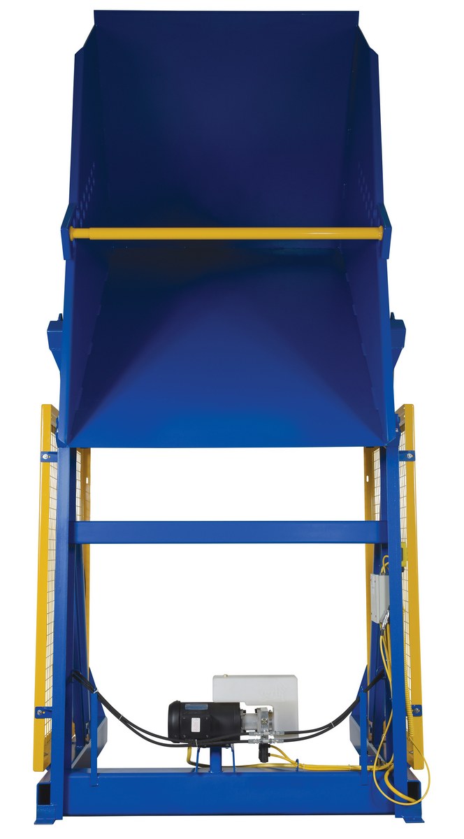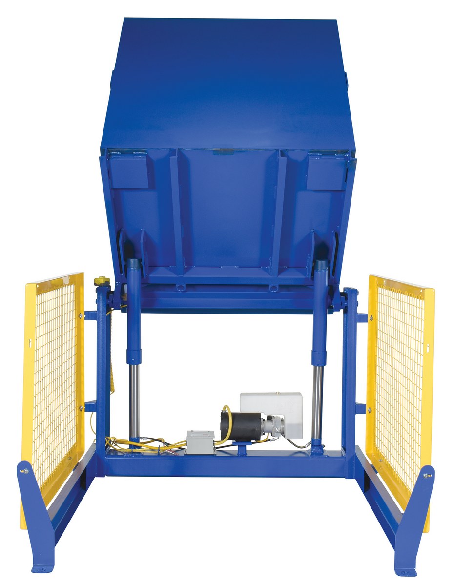 The electric/Hydraulic box dumper is designed for controlled dumping of material from boxes, crates, and other types of containers. It is designed for pallet truck loading and unloading. The retaining bar adjusts to accommodate a wide range of container heights. Each dump height has a hold down range and an internal power unit with a hand held control standard. It has a heavy-duty welded steel construction with protective mesh side screens included.