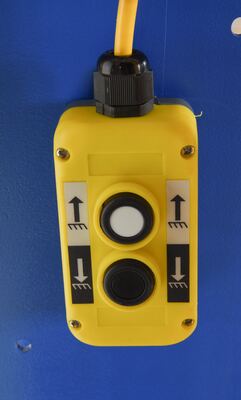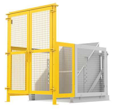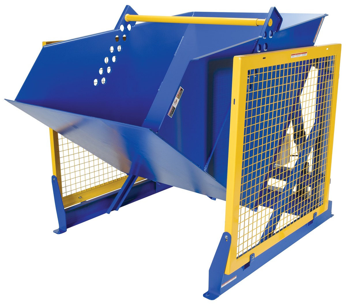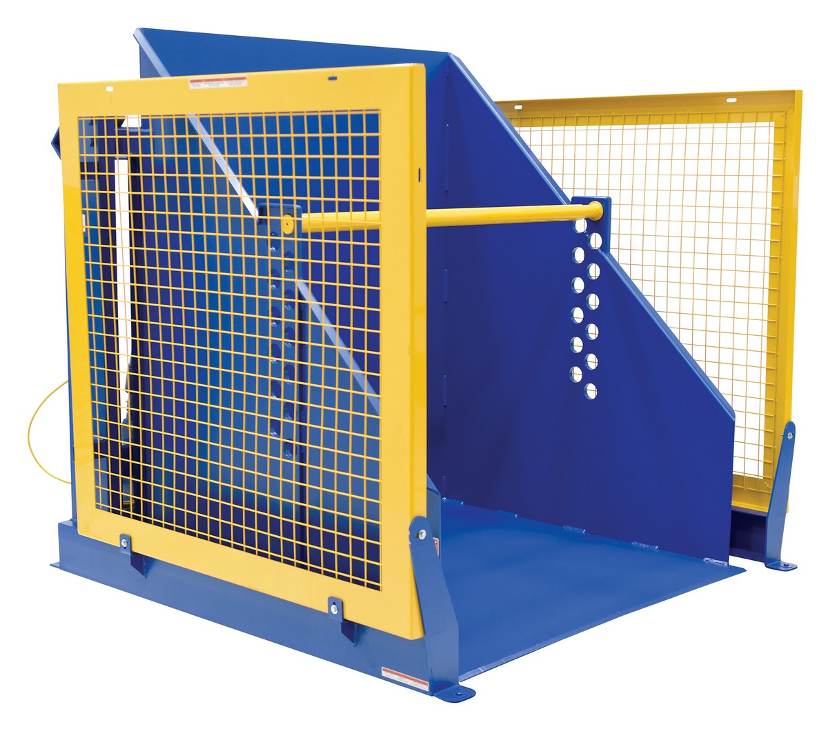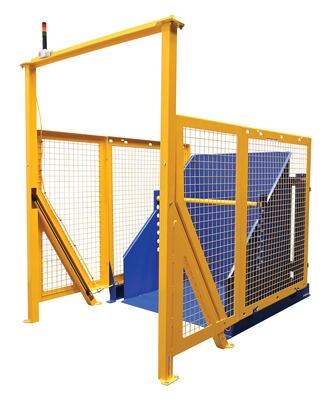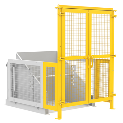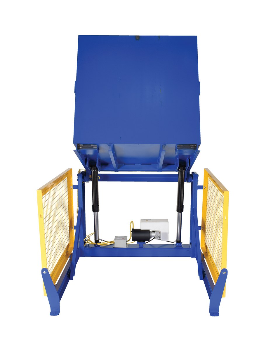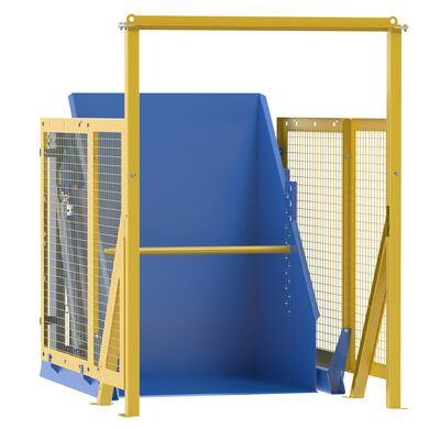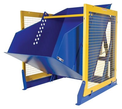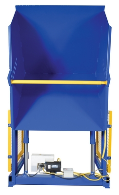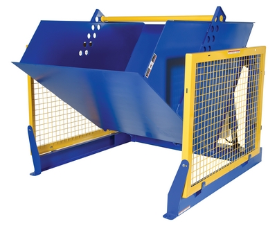 The electric/Hydraulic box dumper is designed for controlled dumping of material from boxes, crates, and other types of containers. It is designed for pallet truck loading and unloading. The retaining bar adjusts to accommodate a wide range of container heights. Each dump height has a hold down range and an internal power unit with a hand held control standard. It has a heavy-duty welded steel construction with protective mesh side screens included.