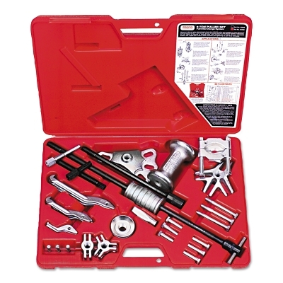 T-Handles Rod; (2) Slide Hammers; Reversible Adjusting Nut; Two Jaw Yoke; Three Jaw Yoke; 2 Way/3 Way Slotted Crossarm; (6) Reversible Jaws; (2) Inside Jaws; (3) Jaw Pivot Pins; Inside Hook Jaw; Forcing Screw; Standard Detachable Tip; (9) Cap Screws; Short Slide Rod; Rear Axle Flange Foot; Blind Bearing Adapter; Gear and Bearing Separator; Molded Case