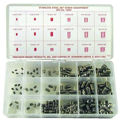 Includes:(10) 10-24 x 1/4 in; (10) 3/8-16 x 1/2 in; (10) 3/8-16 x 3/8 in; (10) 3/8-24 x 3/8 in; (10) 6-32 x 3/16 in; (10) 8-32 x 3/16 in; Plastic Box; (20) 1/4-20 x 3/8 in; (20) 1/4-28 x 1/4 in; (20) 5/16-18 x 1/2 in; (20) 5/16-24 x 3/8 in; (25) 1/4-20 x 1/4 in; (25) 5/16-18 x 3/8 in; (5) 1/4-20 x 1/2 in; (5) 10-32 x 1/4 in; (5) 10-32 x 3/8 in; (5) 4-40 x 3/16 in; (5) 6-32 x 1/4 in; (5) 8-32 x 1/4 in