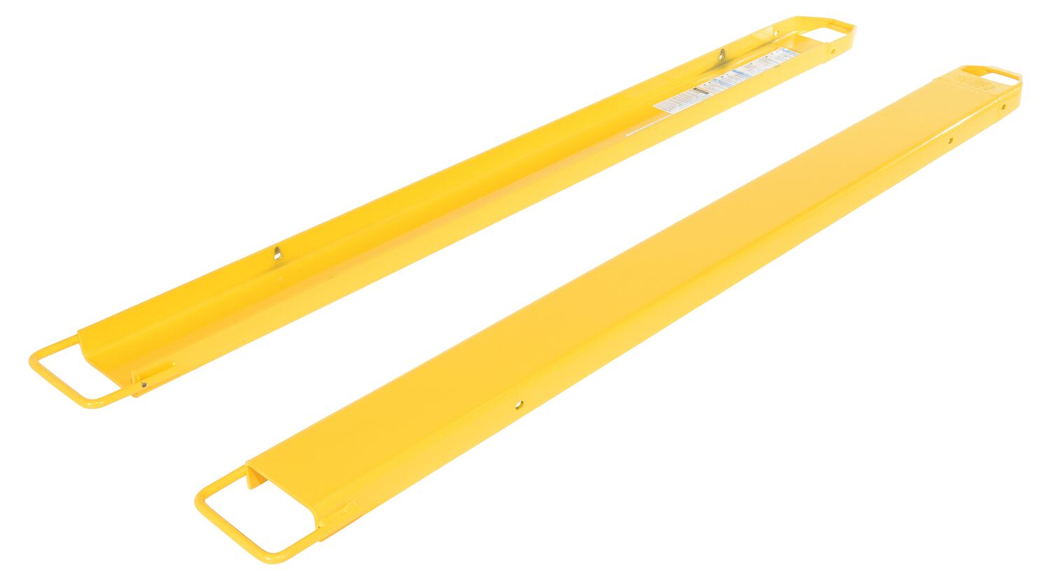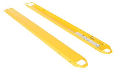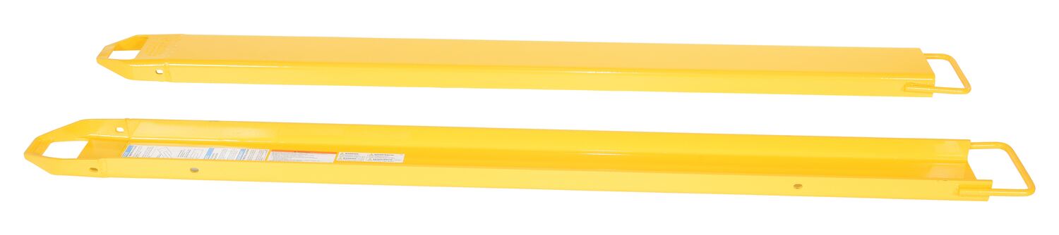 Provide the extra support needed to lift long or large objects with a fork truck using a pair of fork extensions. Welded steel construction with cast steel tips. Steel retaining strap prevents fork extensions from sliding off forks during use. Powder coat yellow finish. OSHA regulations require that extensions are no more than one-hundred and fifty (150) percent of the existing fork length. Remove pin and lay extension over fork or drive fork truck into the extension. Re-insert the pin behind the heel of the fork to secure extension. To be used with class 2 and class 3 forks only.